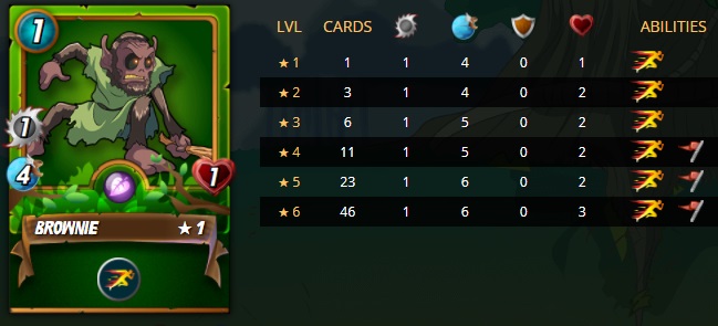 Brownie: Another rewards card to recently hit the print cap, the Epic Earth Brownie provides an immediate +1 speed with Swiftness and a +1 melee at level 4 with Inspire. With dual useful abilities, Brownie is being utilized nearly 7% of the time by top 25 players. The downside for those interested in the game economics lies in the leveling. Inspire is achieved at level 4, and level 5 and 6 only add an additional speed and health for a steep card combine cost. Regardless, Brownie will remain a heavily utilized card in Earth decks.