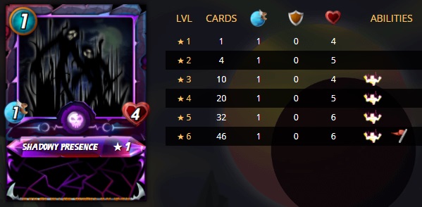 Shadowy Presence: Recently added to the reward card series, Shadowy Presence adds another important 1 mana card to the Death splinter. In a similar design to Albatross, Shadowy Presence does not wield an attack ability, but it add Strengthen and Inspire to the deck. With six health at level 6, expect this card to be fully maxed in most competitive decks, as the lack of attack will help keep it alive longer. The dual supporting abilities that influence attack and defend should result in Shadowy Presence receiving heavy use. Will Death decks start including this card over Cursed Slimeball or will there possibly be room for both?