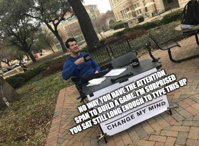 But somehow my not so smart donkey ass ended up not only playing magic the card game when it was new and tossing around black lotuses at lunch like the cardboard it was, I ended up in bitcoin when it was trades less than it cost to print the damn black lotus in the first place. I somehow ended up with the fund to not only end up with 10% of the market cap of a game I assume was going to die and become worthless but I don't even remember my second thought, sorry about that. But anyway I can fund an open sourced game that is not about money, that takes not a lot of money, I think the cost is honestly really close to 0, so If you are worried about money, I can cover just above 0.