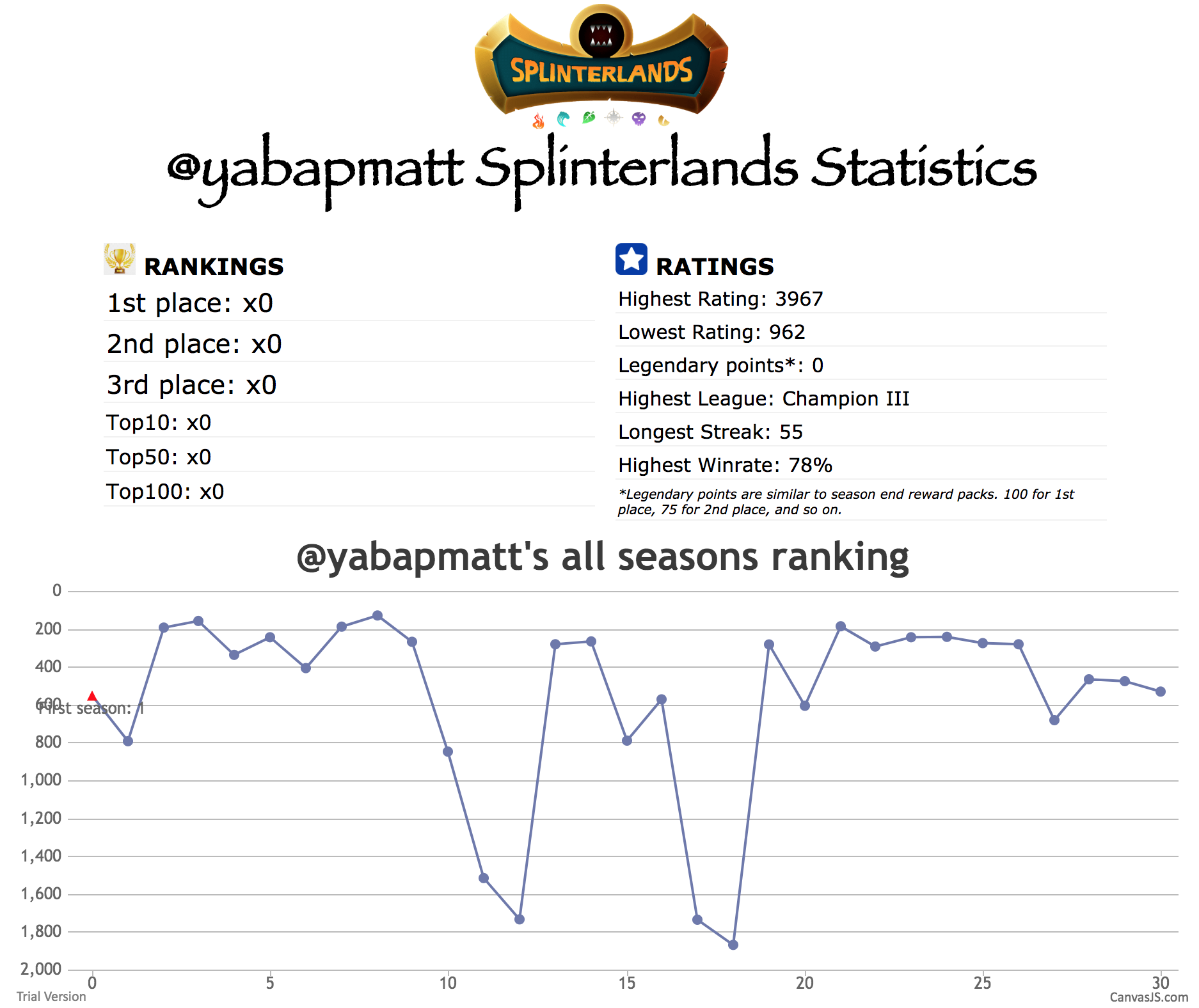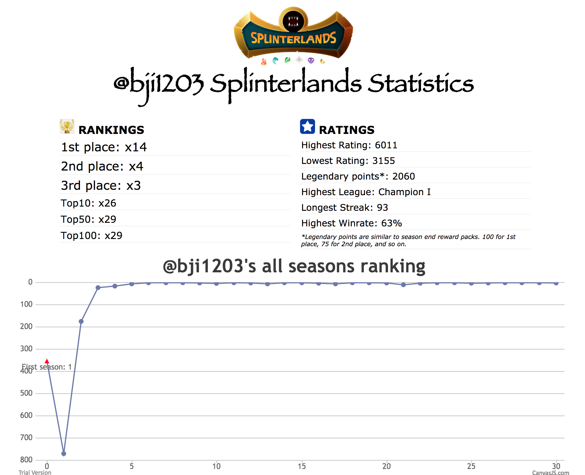 This fellow was ranked First for a crazy 14 seasons! He is also in the Top10 for 26 seasons and only missing out during his first 3, probably he was just starting out the game then. Another impressive stat was his Longest Streak at 93 wins. I wonder if he did that when he was in the top of the leaderboard. His Legendary Points is 2060 which I believe is the highest in the whole game.