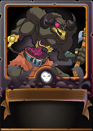 At Maximun Level, the 6-Mana Undead Minotaur has a Melee Attack of 3, a Speed of 4, a Health of 8, and two abilities: Double Strike and Retaliate.