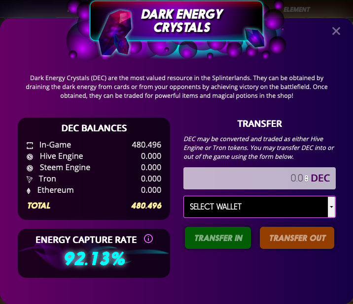 The Dark Energy Crystal (DEC) is a digital token that runs on the HIVE blockchain can be transferred directly from the game to Ethereum (ETH) wallets, among others cryptocurrencies, and then sold on exchanges.