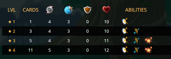 Immediately you can see that it only grows to a Level 4 with 11 bcx. For those of you newer to Splinterlands, this is because it is a Legendary card. At its Level 1 (1 bcx) this beast packs 4 melee, 3 speed, and 10 life. Unlike the other card we looked at, it does not possess Flying but instead has Magic Reflect. This comes in handy if your opponent is playing a Water splinter with a likelihood of heavy Magic damage. All this for 8 mana. As you push this to its MAX level (11 bcx) you see the more powerful stats are 5 melee, 3 speed, 12 life and Magic Reflect, Return Fire, and Blast. Return Fire is great in formats where you are going to be taking heavy Ranged attack. Blast is an all round great ability to inflict double the damage and take out your opponents "on deck" monster.