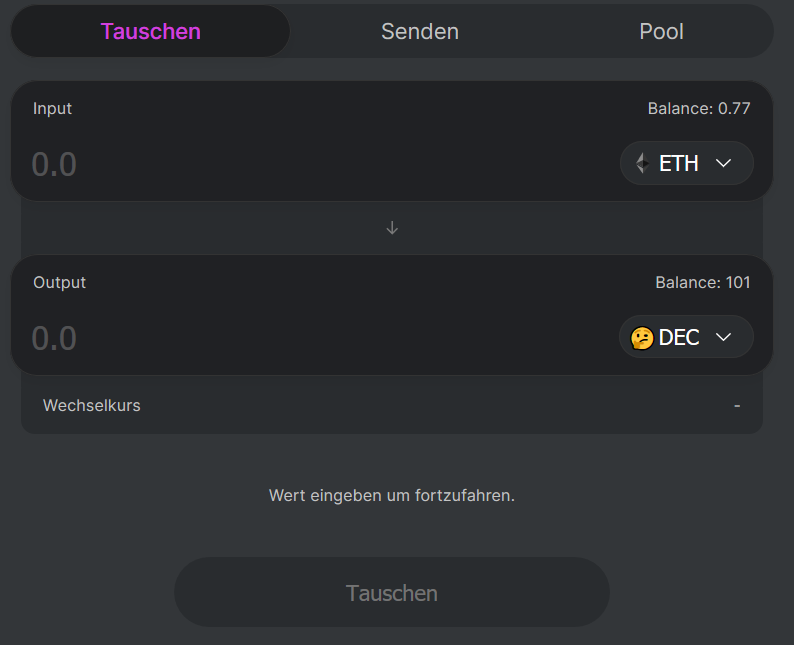 If you have DEC in your Ethereum Wallet and want to trade them against ETH (or other ERC20 tokens) you can easily do this using the decentralized Uniswap Exchange. Uniswap operates directly on chain, this means you don't have to deposit your tokens anywhere and you don't even need to create an account.