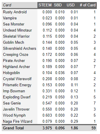 I sold as much as I can, and I am ready to list the next batch. I am trying to go lowest price I can to get STEEM as quickly, but upgrades are costly at this point and i need a lot of cards to level out my decks.
