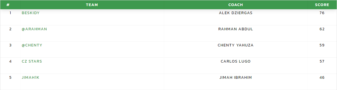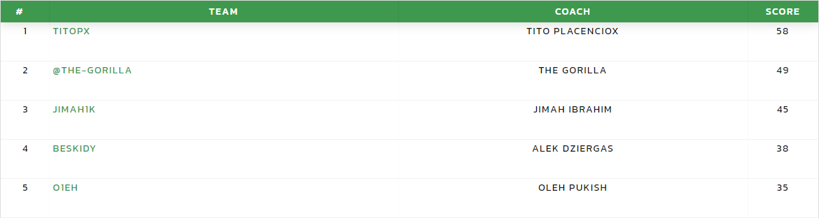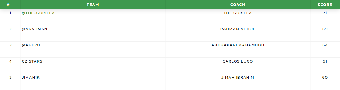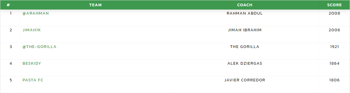 With the likes of Ciro Immobile drawing a rare blank, the astute captain selection of Mario Pasalic helped @titopx on his way to a top score of 58 points in a fairly low scoring week. No other player scoring more than 50 points with @the-gorilla scoring 49.