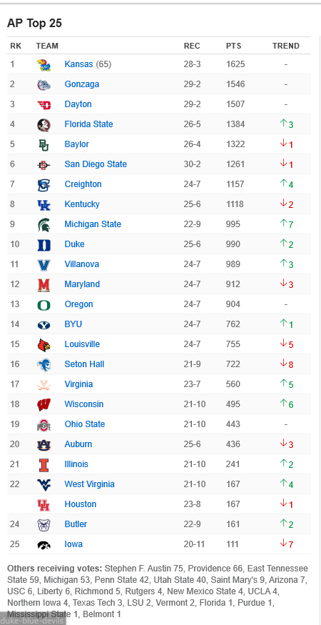 It's been a while since BYU has been in the rankings. With some determination and luck, they might be able to reach Sweet Sixteen this year. That is, if that St. Mary's loss won't bar them from playing (I doubt it). Pope must be doing something right with the players he has.
