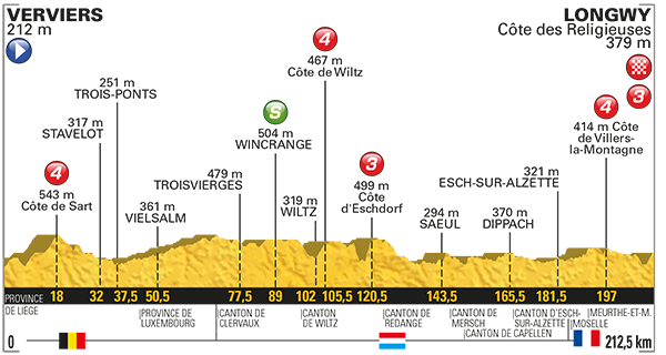 Stage 3 on Monday offers a course which begins in Belgium, crosses in Luxemburg, and will end in France. over the 212 km course. It is bumpy, with almost constant up or down terrain which may be able to drop some of the sprinters and move more of the GC contenders into the top 10. While bumpy, there are no serious climbs for these pros and while some are forecasting a puncher to win, someone who can breakaway from the main pelaton and hold on, I tend to see most of the pelaton reaching the final climb as one, with the top GC guys sticking together to the finish. I would expect Thomas, Froome, Quintana, Porte, Contador and others to all finish within seconds of each other and Thomas probably holding onto the Yellow leaders jersey.