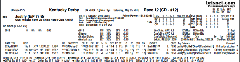 “What was so impressive about Justify in the Santa Anita Derby was that he showed he can finish his race even when going slower in the early stages than ever before. A closer look at his BRIS Pace ratings bear this out – 100, 105, 117. Unlike most dirt horses, he was applying constant pace pressure without any signs of exertion.”