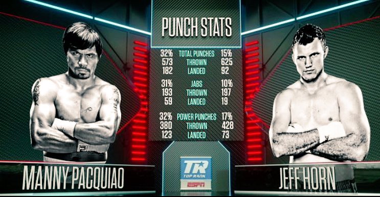 You can clearly see the stats right here. Manny Pacquiao bested Jeff Horn in every single category that matters in judging a fight based on numbers. Not posted here is the fact that Pacquiao also had a 10-8 round in the 9th round in which the referee stated to Horn in his corner that if he did not "show him something" that he would stop the fight. Much to his credit, Horn did answer with two solid rounds IMO winning 2 of the last 3.