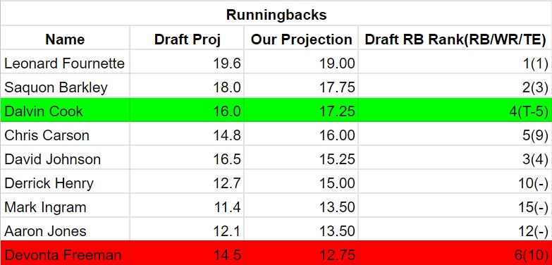 It's really weird seeing Leonard Fournette at the absolute tops of rankings, but here we are. Fournette is technically our number one RB, but Barkley could be a number one pick. His coming off of an injury is a little concerning, but...he's Barkley. We definitely like Cook a little more than Draft and he needs to be drafted very early.
