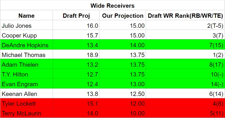 Every RB after that comes after that is fairly meh from a projection standpoint. I like Henry quite a bit this week. Hopefully the offense take a step forward with Ryan Tannehill getting the start(words I never thought I would write) and the Chargers defense is dealing with injuries all over the place.