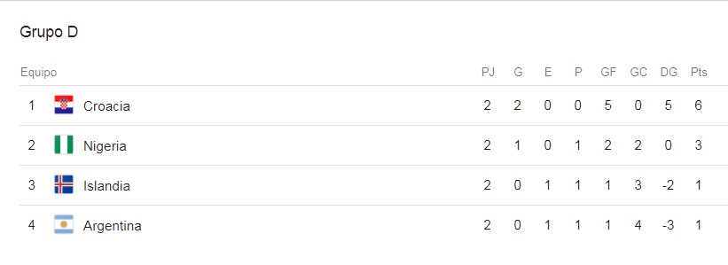 Una victoria de Nigeria ante Islandia en la segunda jornada le permitió a la oncena dirigida por Jorge Sampaoli estar con posibilidades de clasificación, quedando en manos de los argentinos su acceso a la siguiente ronda.