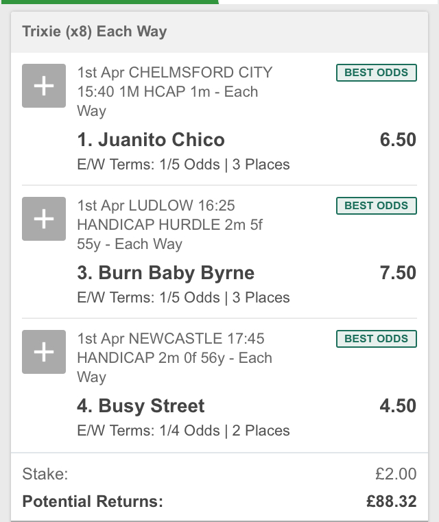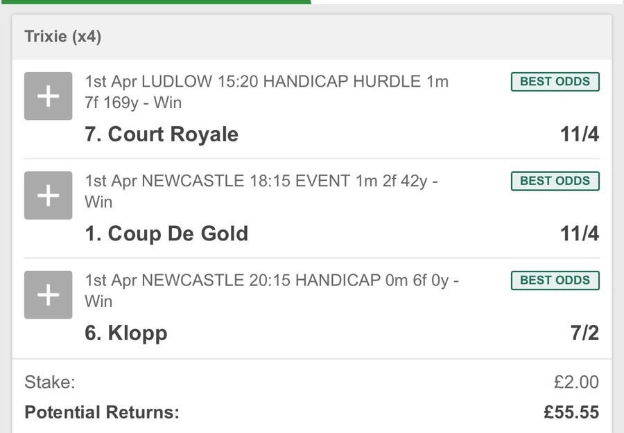 ”From a very tired me, these selections are on a theme with what I go for. Gold and Royal(e) being my go to due to previous total luck with those names. And I didn’t want to miss out on Klopp after yesterday’s drama. 50p trixie returns £55.55 - has a nice ring to it!”