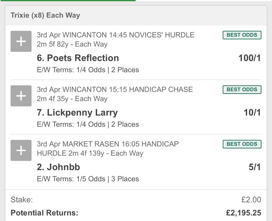 ”John B, Lickpenny Larry - couldn’t miss those today. And I’m not giving up on the poetry, even at 100/1 in a six horse race...”