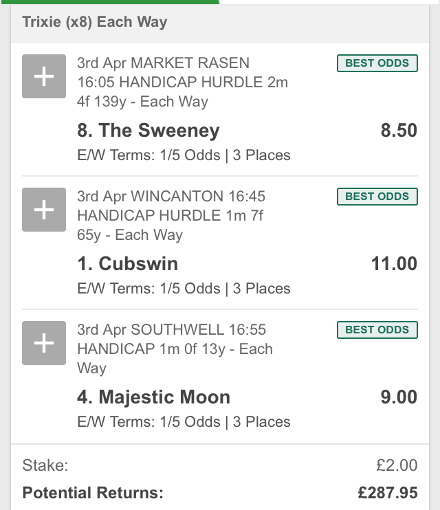 Such is life and such is gambling. In fairness two places out of three would be great if it could happen every other day with a threes-up now and again to tip the whole endeavour into the beautiful green land of profit. Sadly theory and reality are never easy bedfellows.
