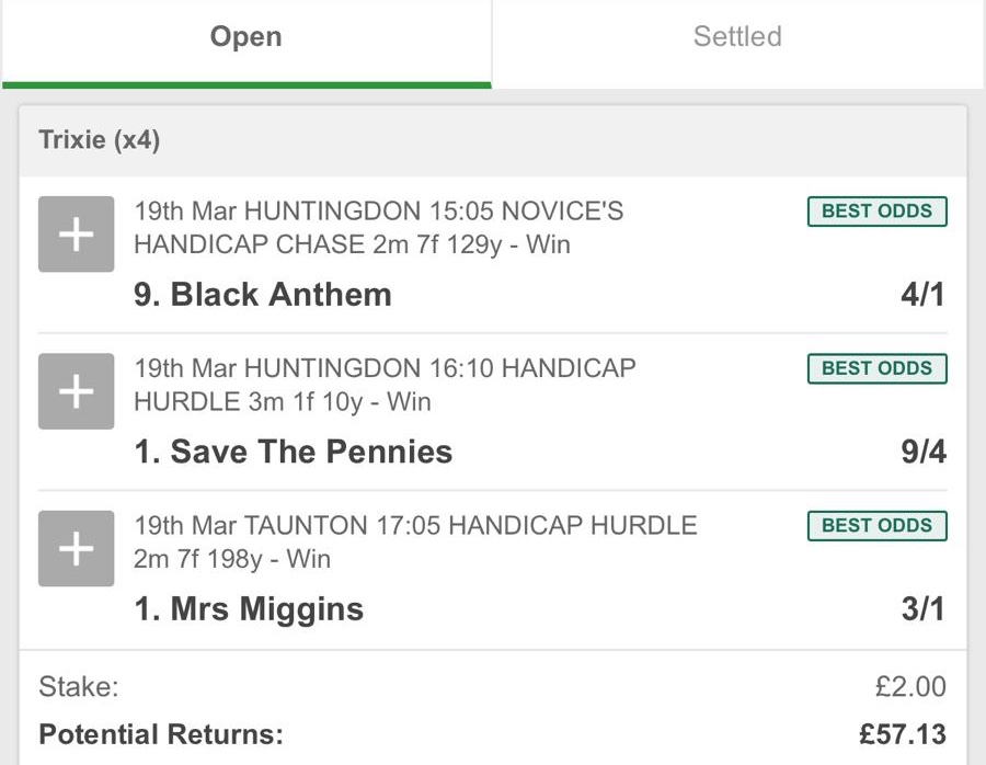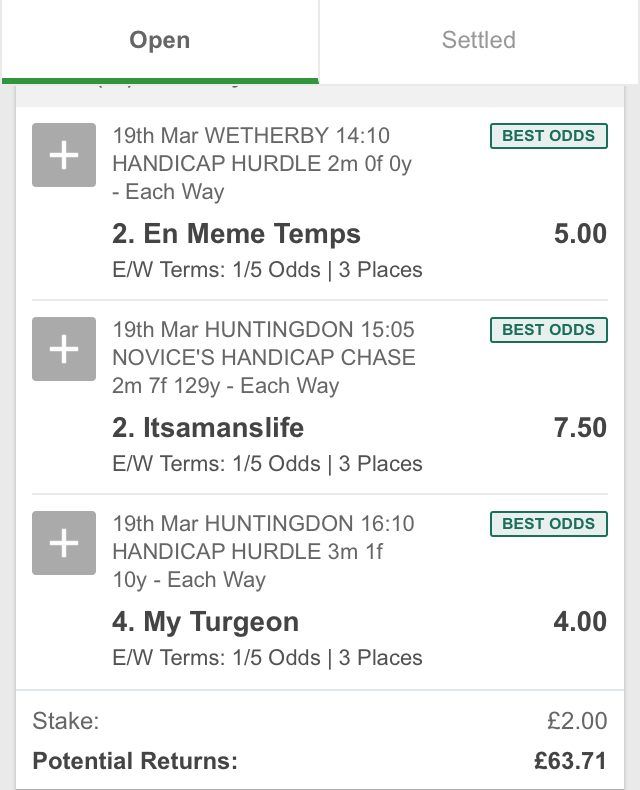 It’s very much more of the same from me today. The racing on offer looks to be of dubious quality, owners perhaps giving the second string a run out between Cheltenham and Aintree, an equine stock take, if you will, to see what may or may not be a good prospect for next year. Richard Johnson takes the ride on En Meme Temps and in a race of limited ability the champ is always likely to make a difference. Itsamanslife is a course and distance winner at Huntingdon while My Turgeon is really nicely handicapped and with Nico de Boinville on board looks the nag to beat.