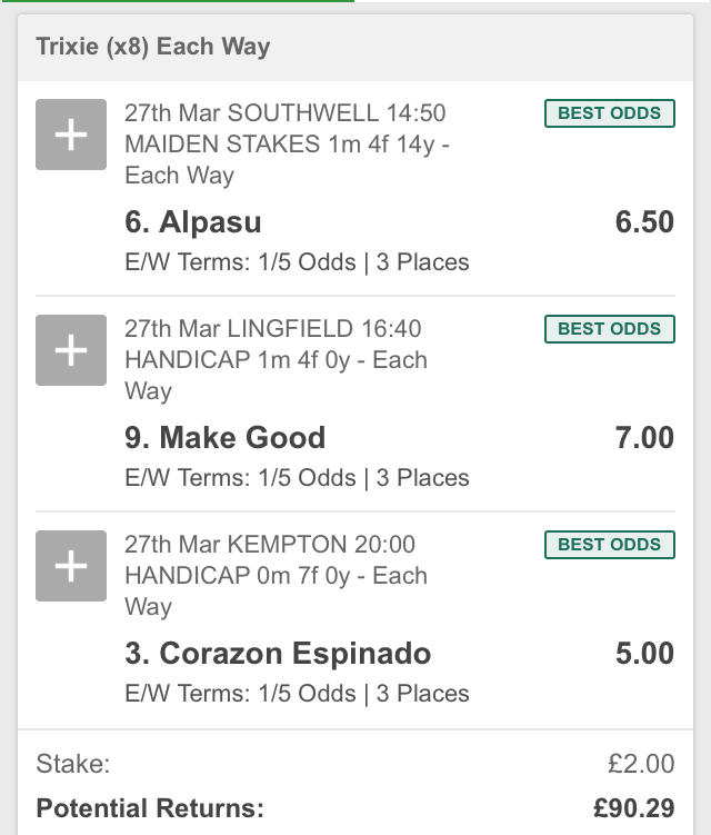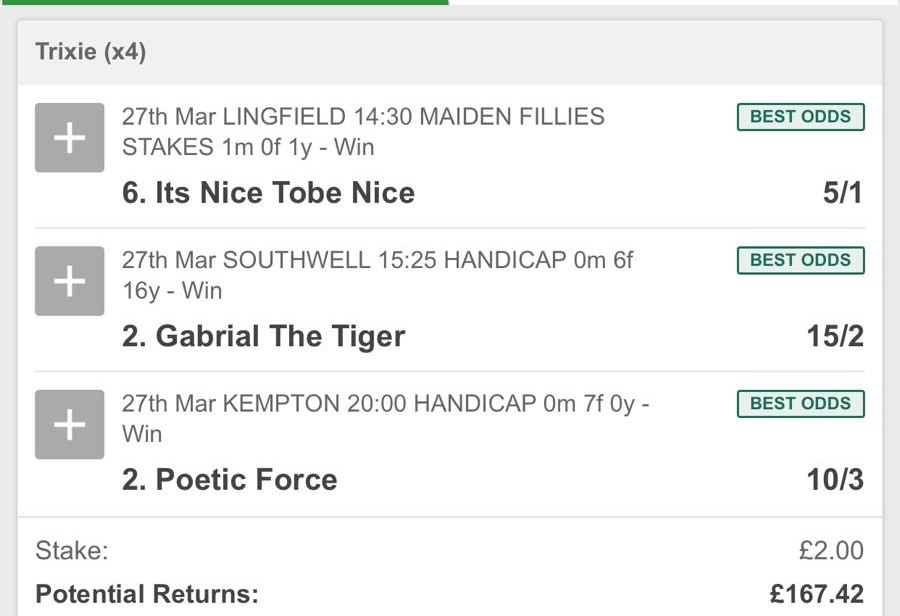 All of Luck’s selections look to be in with a decent shout and I thought long and hard about backing Poetic Force at Kempton before going with Corazon Espinado. I have no doubt that thought and process should win this experiment ninety-nine times out of a hundred but fortune will always have her day, is this it?