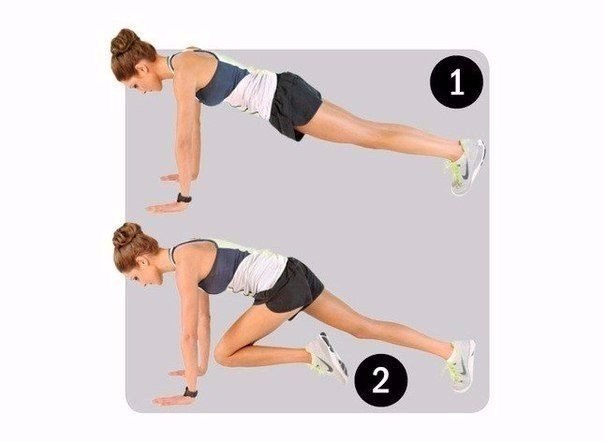 - Start from the stop lying (1). Bend your left leg, pulling the knee to the chest (2), return to starting position, repeat the right foot. Do it quickly, as if running a hundred meter. After four repetitions, bend your arms at the elbows at a right angle. Return to the starting position