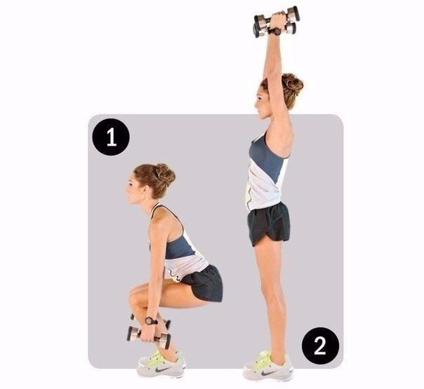 - Take dumbbells (a minimum of 3 kg each), place your legs slightly wider than your shoulders, hands along your body. Perform a squat: the hips are parallel to the floor, the back is straight (1). Do not let your knees go beyond the line of the toes. Straighten, resting his heels on the floor, simultaneously bringing dumbbells to his shoulders, and then lifting him up; palms inward (2). Lower your hands.