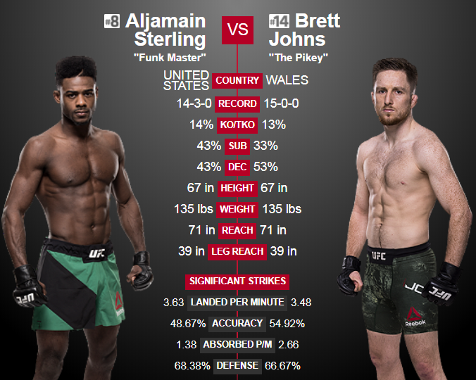 Another great technical fight taking place at 135 pounds, both guys are ranked and very game, Sterlin is ranked a little higher, but I don't think it will bother Johns one bit as he has the heart of a lion and real will to win.