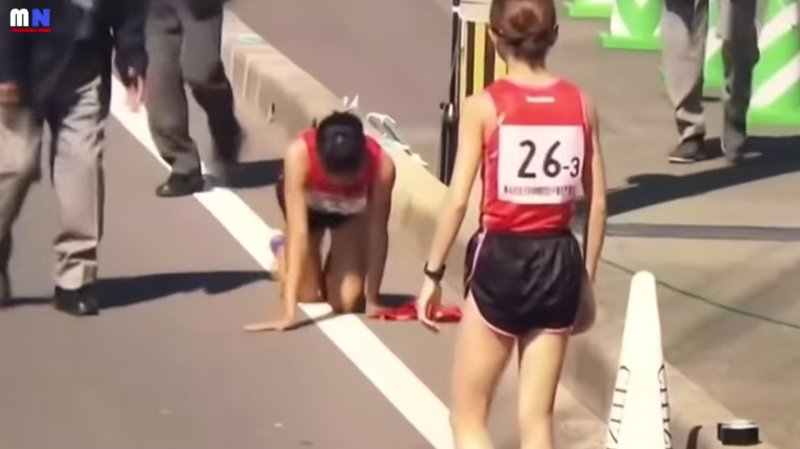 Rei Lida walked between 200 and 300 meters in this way, her companion who was waiting for her in their respective point of relief could not hold back the tears of seeing her companion make such an effort. Her remarkable display of willpower allowed her to continue rather than give up. In the end they let her finish her stretch so that her companion could continue with the race.