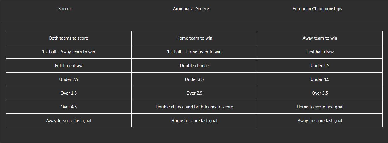 The available options differ from each other depending on the sport in question.