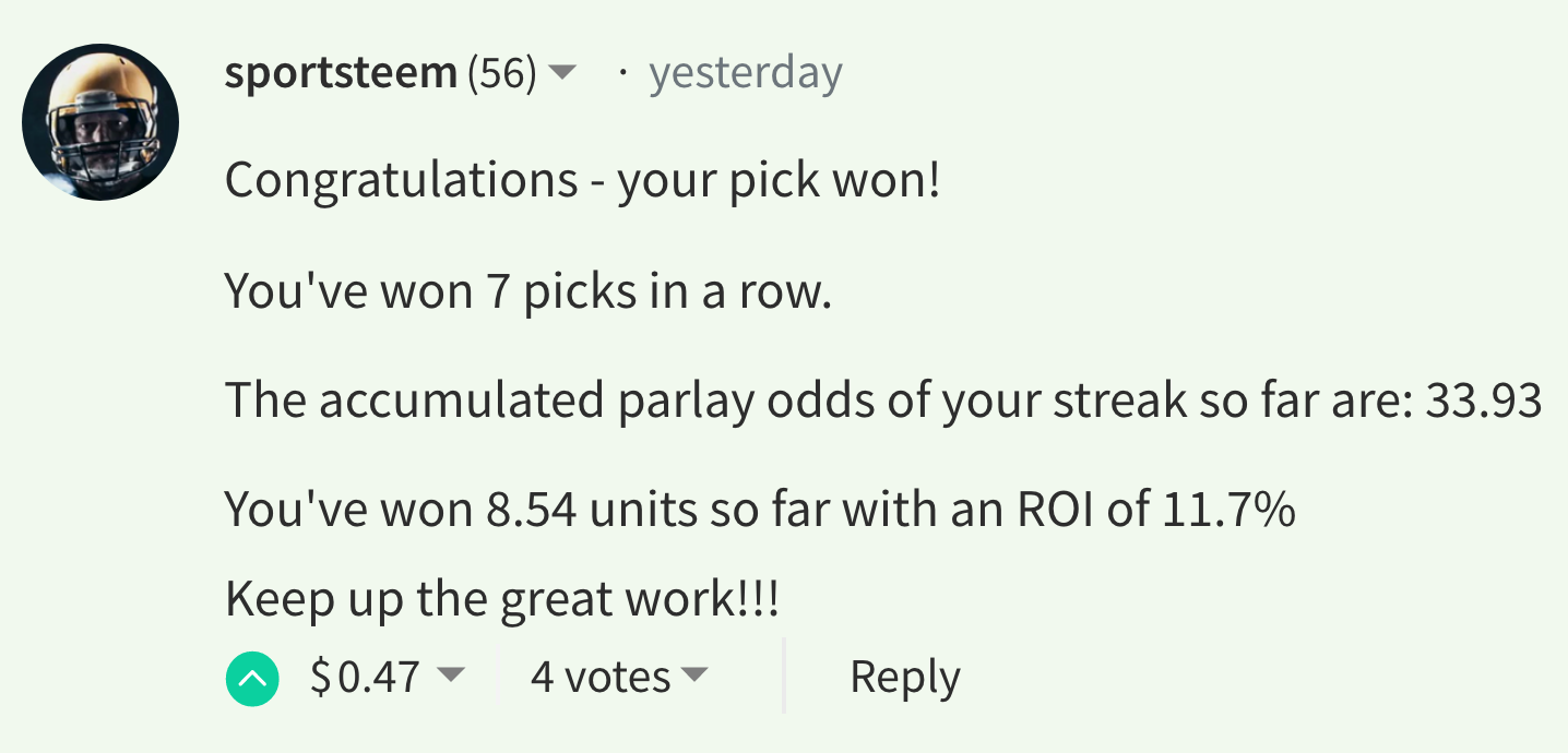 Track your pick with @sportsteem today and enjoy 100% upvotes from our friendly bot and expert handicappers!