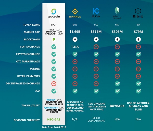 • BNB, KCS, KNC VE BIX, Ethereum alt yapısı ile geliştirilmiş, SPOT ise Neo altyapısını kullanacak ve hm Neo ile büyüyecek hem de hızlı ve ekonomik transfer sağlayacak.