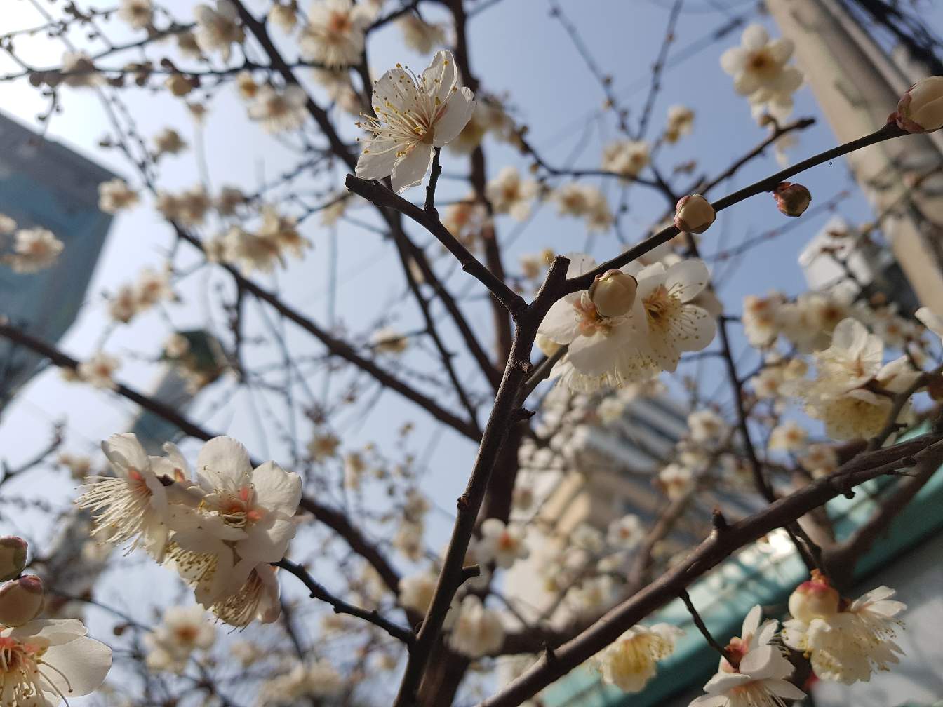 Today i come to buy a gift for my friend. I see the flower of the tree. It's the signal of the spring. I love it. It's so cool and comfortable.