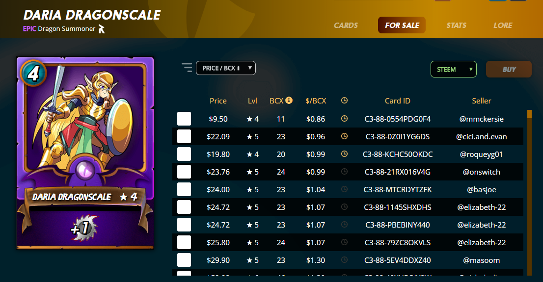 Daria Dragonscale is one of the most powerful and famous Dragon summoner cards the game has. I have not been very good with Dragon summoners. I was wondering if it would be good to upgrade some of my dragon summoner cards so that I can at least give it a try in the next few games. That is the reason why I checked the availability of this card in the market. I know it may not be the best price to buy but I just wanted to use it.