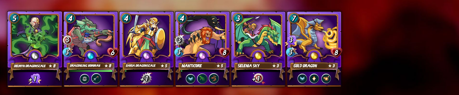 All of the five basic rare summoners are on level 6 and the legendary Dragon summoner Selenia Sky on level 3. This allows for maxed out common cards on level 8, rare cards on level 6, epic cards on level 5 and legendary cards on level 3. You can get very far with such a deck and safe yourself the really expensive final 1-2 levels of each card.