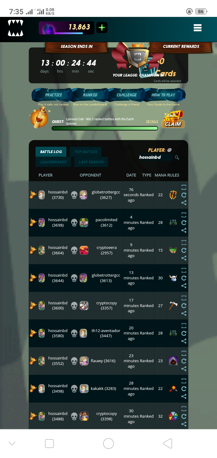 Yes @clove7 it's hard to do quest in champion league but sometimes it happens when I play with death splinter, we should not do this, we should look at our erc and focus on wining, thanks and happy battling.