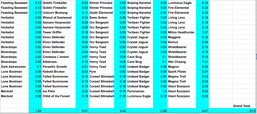 Let's assume for a moment I am going to dump all 100 cards at the current market price. According to the table below, I am taking about a 50% haircut. Yes, this is a small sample size, but it is about on par with what I was getting while the Beta cards were still on the market. One gold Legendary could change the whole story. In my case, the STEEM price would need to double for me to break even (not so far fetched). I could have bought all of these cards on the open market, but I would have needed to: