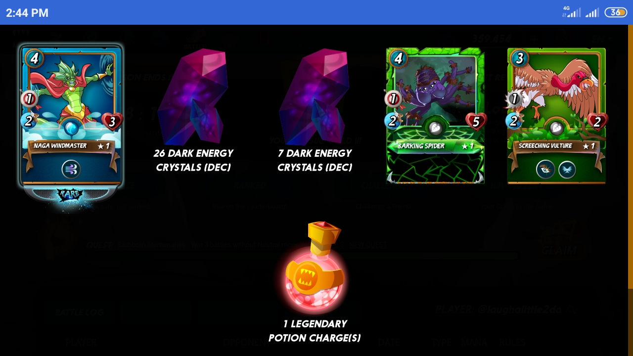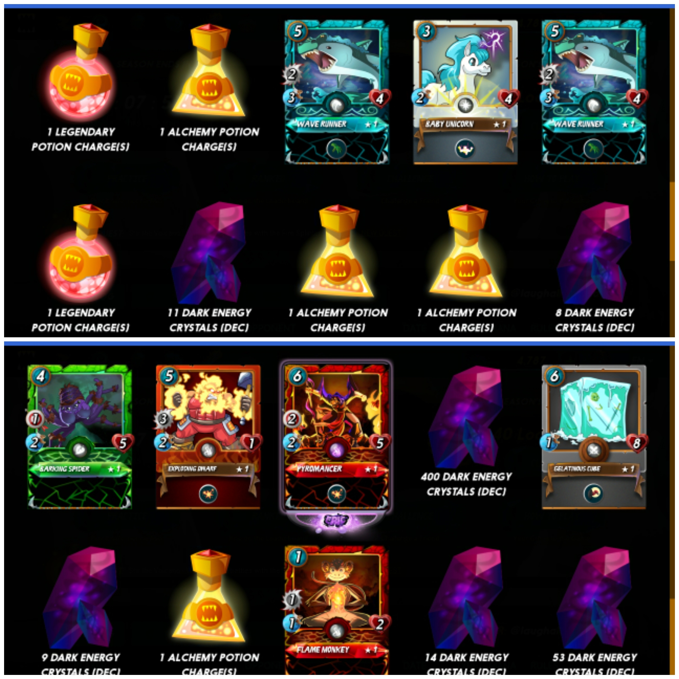 474 total DEC, 9 leg Potions, 5 alchemy Potions, 12 common cards, 1 rare and 1 epic from 40 chests