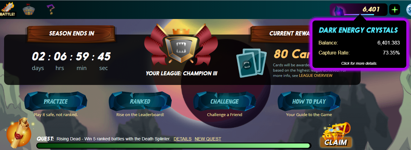 다크 에너지도 오늘은 70%대에서 멈췄으니 내일은 조금 더 충전 된 다크에너지로 DEC채굴 효율이 높아 질거라 예상 해 봅니다. 어제 일퀘를 마치고 점수대가 3400 점대여서 내일 정도에나 챔피언 등급으로 올라갈거라 예상 했는데 의외로 대박 경기가 나와줘서 올라간듯 합니다. 정말 기대도 안했던 배틀 이였는데 혹시나 하고 고른 카드들이 대박을 쳐 줬습니다.
