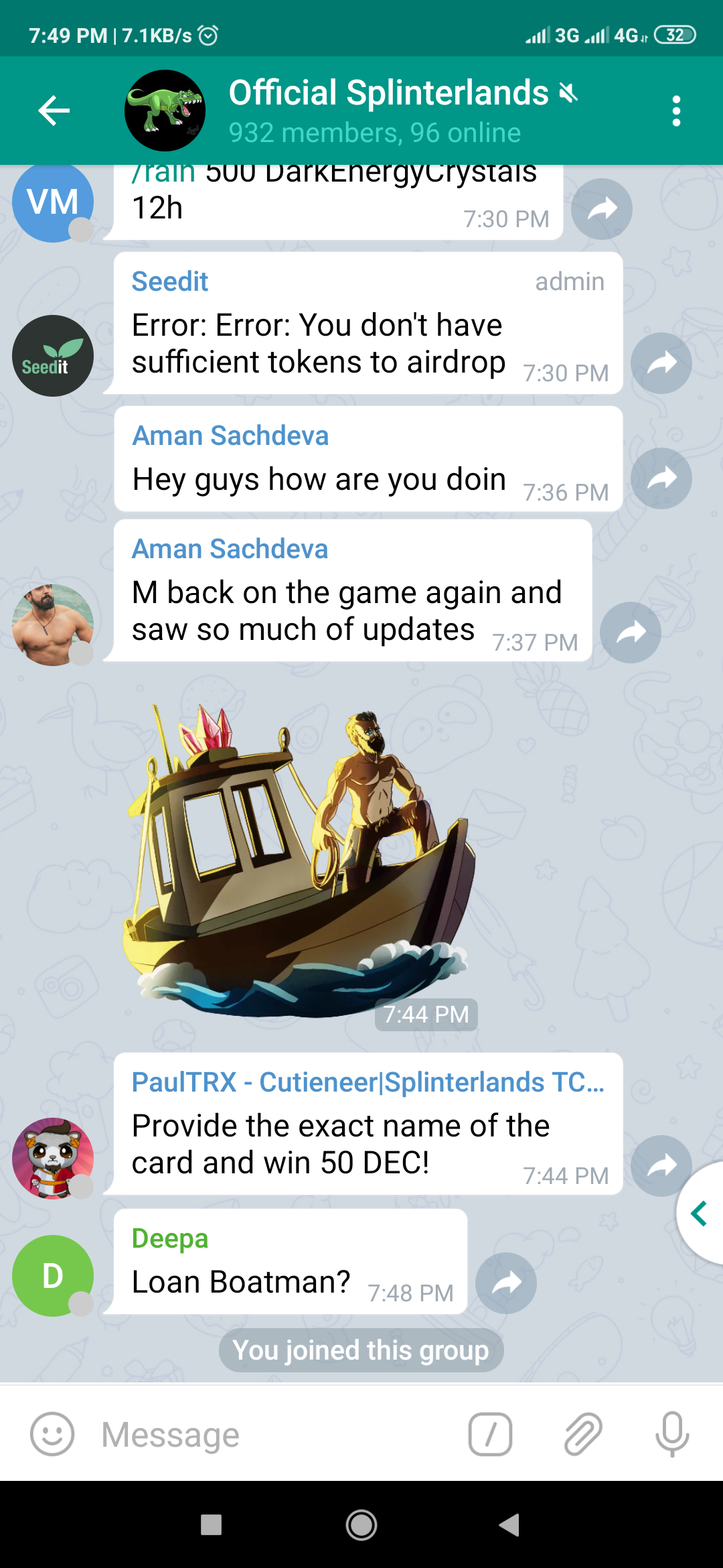 Hi everyone! Things are looking very nice in the Splinterlands Discord, Facebook and Telegram! Make sure to join them all today if you have not yet. The Discord group gets most of the traffic and is very busy. You can always get a question answered in there very fast! Make sure to join Telegram today and get in on @grapthar's Telegram trivia contest! You can read all about it HERE. You might even get lucky and get in on some airdropped DEC from me (@clove71) in Telegram. A big shout out to fellow Splinterlands Facebook Admin. and Telegram Admin. @shaidon! He has been busy accepting many new members in the Facebook group and helping people out in Telegram! Follow him for awesome Splinterlands content! I also want to thank him, @vcdragon and @yonilkar for giving a great recommendation on the Facebook page!