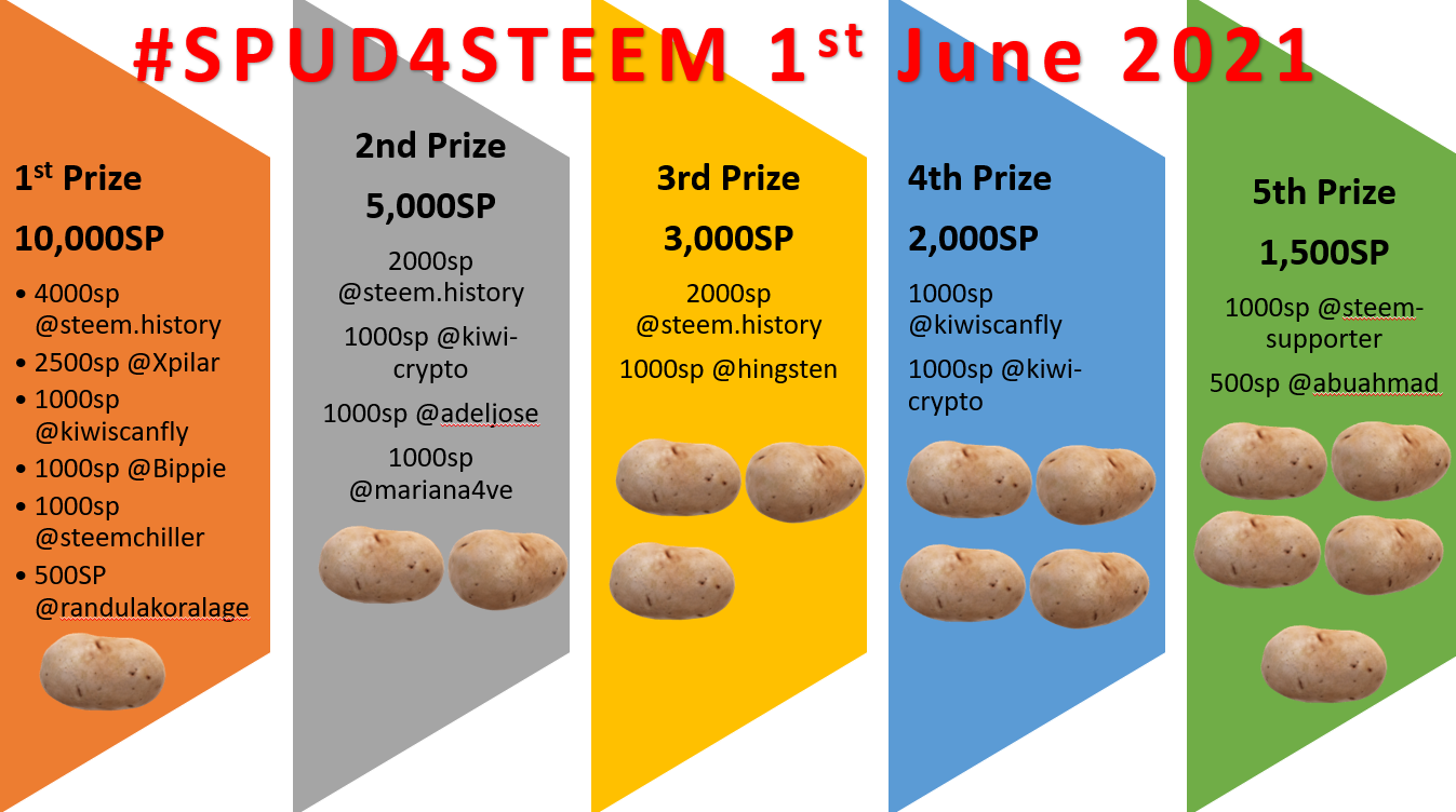 We have an increased prize pool for the June #SPUD4STEEM which means we have 21,500 Steem Power by way of 21 day delegations.