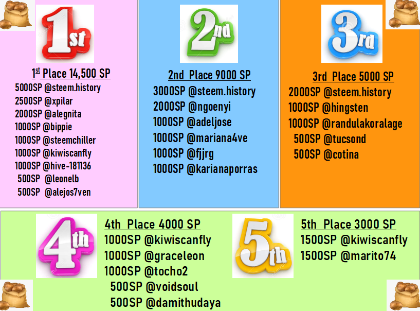 Thanks to our existing sponsor @marito74 who offered to increase her 5th place delegation from 1000SP to 1500SP, since myself & @marito74 are the only sponsors of 5th i thought i would match it ๐