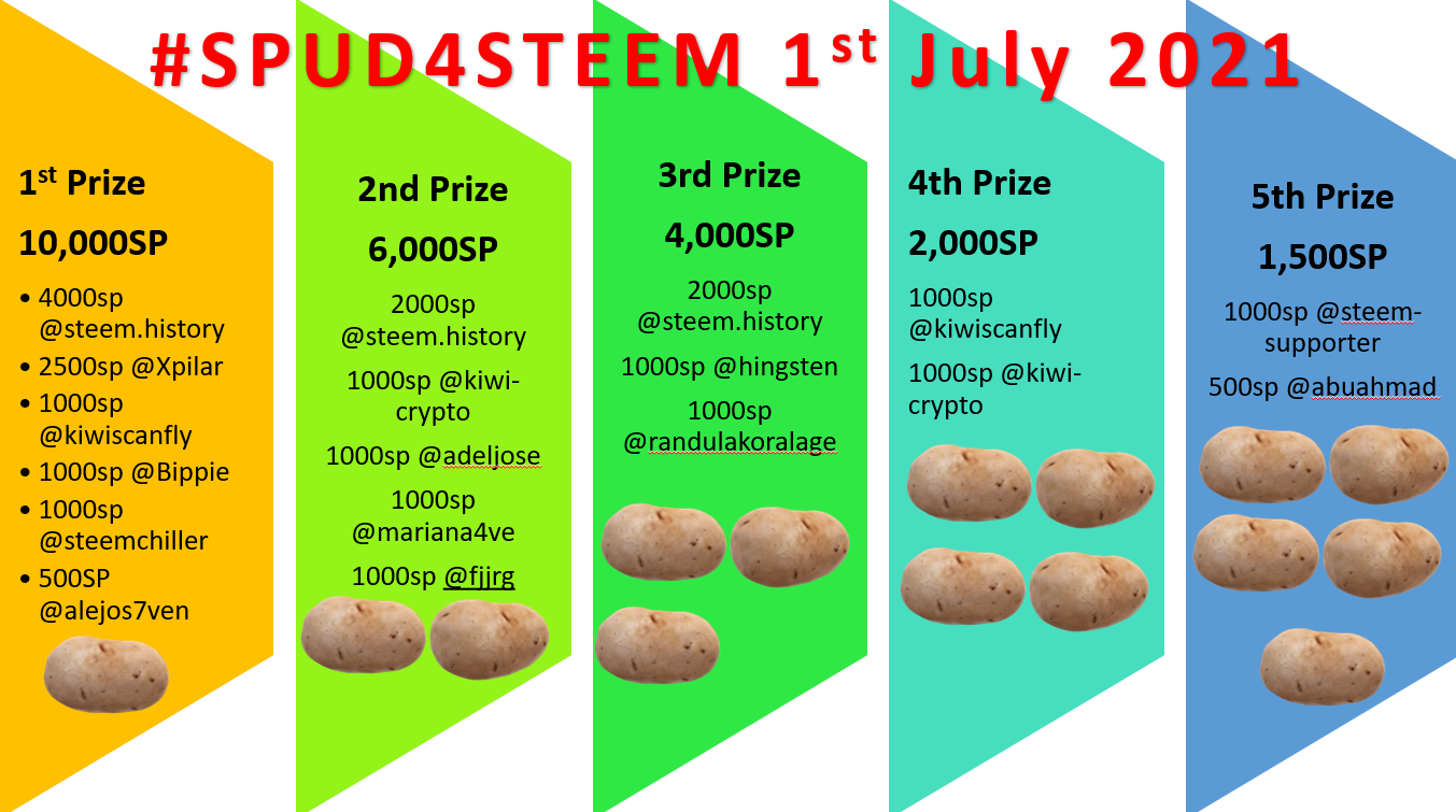 @fjjrg has offered to sponsor 1000SP for #SPUD4STEEM which means we can increase the 2nd prize to an impressive 6000SP, imagine having an extra few thousand Steem to vote with?