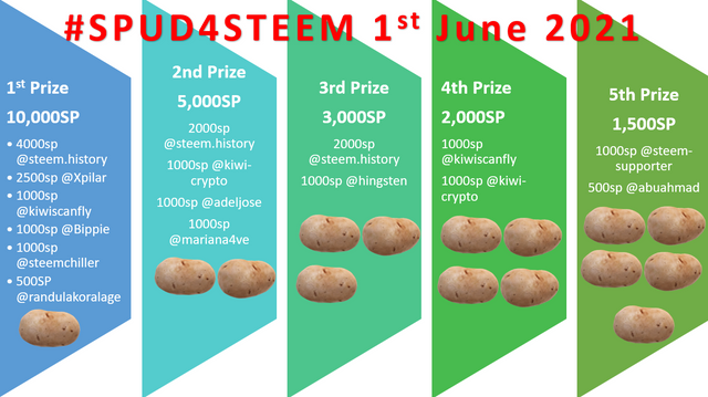We are just 5 days away from the biggest prize pool in #SPUD4STEEM history with 21,500 Steem Power on offer by way of 21 day delegations. All we are asking people do do is follow our Guidelines/rules & power up some STEEM POWER - who knows you may walk away a winner? Here are our Guidelines/rules