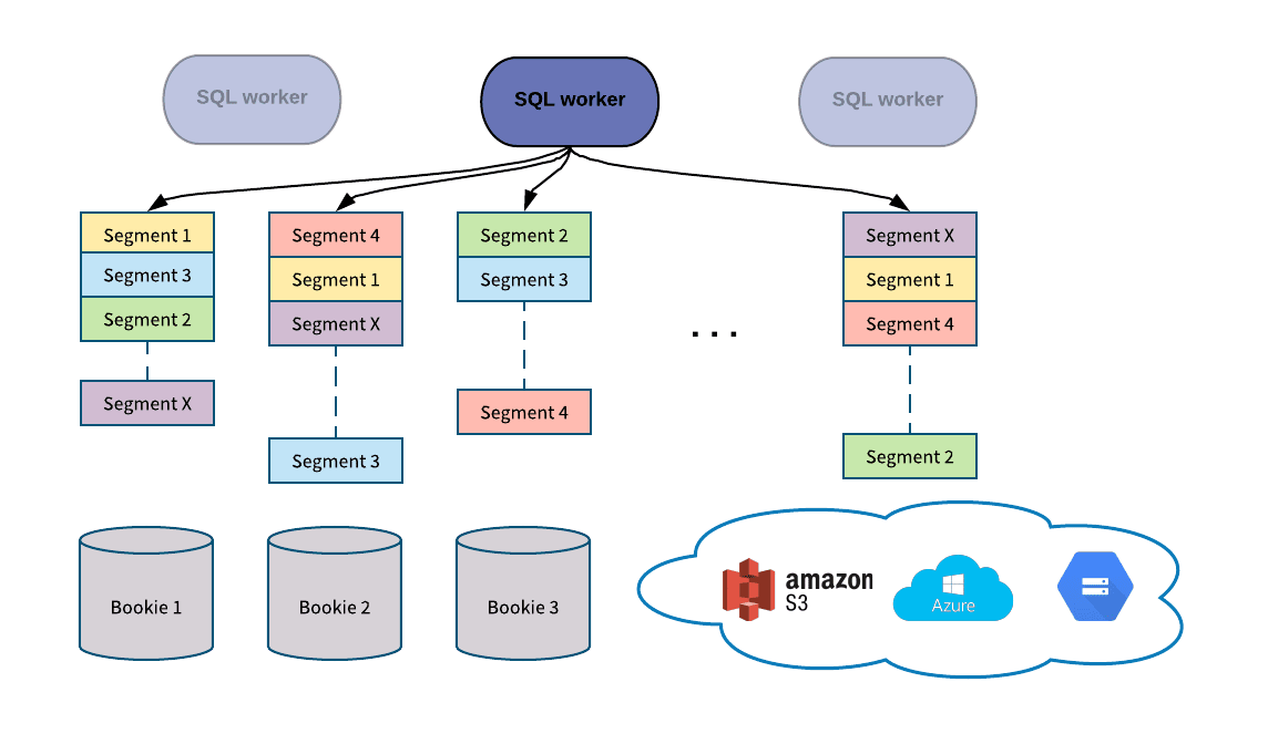Pulsar SQL was designed to maximize data scan speed, thus the Presto Pulsar connector reads data directly from Bookies (not via Pulsar’s Consumer API) to take advantage of the Pulsar’s segment-based architecture. While the Consumer API is suitable for consuming messages in a pub/sub use case, it is not necessarily optimized for bulk reads. To maintain ordering, each topic in Pulsar is served by only one Broker, thus constraining the read throughput to be that of one Broker. To increase read throughput users could utilize partitioned topics, but Pulsar wants users to be able to query topics in a performant manner without having to modify existing topics. For the querying use case, we don’t really care about ordering, we just need to read all of the data. That makes it a better approach to read the segments that make up a topic directly. Since segments and their replicas are spread among multiple BookKeeper bookies, Presto workers can read segments concurrently from horizontally scalable number of BookKeeper nodes to achieve high throughput. To achieve higher read throughput, users can simply configure a topic to have a higher replica count.