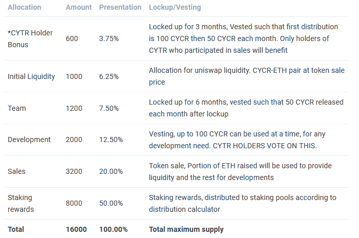 The total Maximum supply of this token is 16,000. The initial supply is expected to between 3000-4000. With the governance of the CYTR holders, the supply of the CYCR token is strictly controlled.