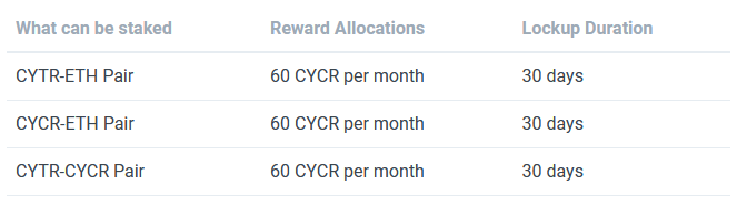 CYCR is the platform’s rewards token. Holders of this token can stake this token and receive rewards. With the governance of CYTR, CYCR will be implemented in the staking of other DeFi projects and also, other utilities will be developed around CYCR.