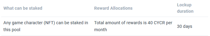 This allows users to stake their assets (game characters) and get rewards. Only game assets are required to be staked in this pool.