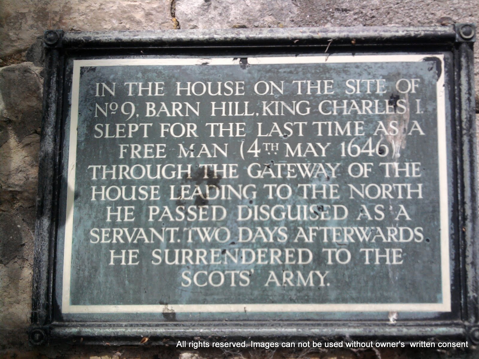 Here is what was written: In the House on this site of No 9 Barn Hill, King Charles I slept for the last time as a free man (4th May 1646). Through the gateway of the house leading to the north he passed disguised as a servant. Two days afterwards he surrendered to the Scots’ Army
