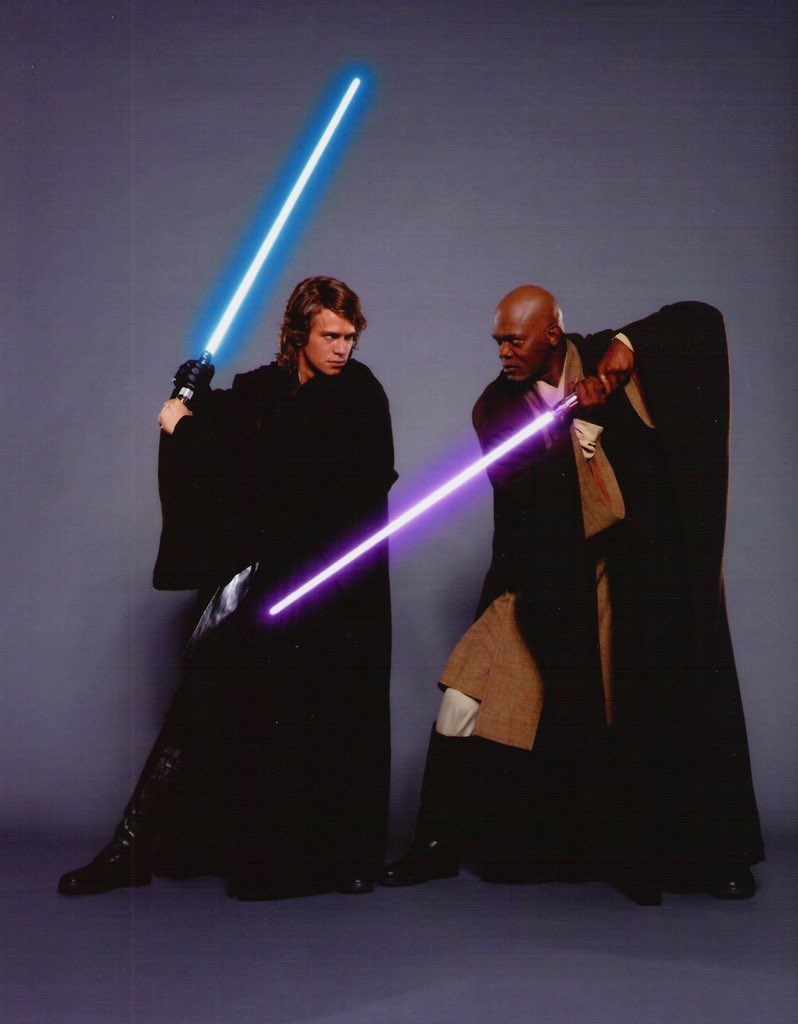 Each actor, whose hero was relying on a film of lightsaber, had the right to choose the color of the sword. Mostly blue, like Anakin Skywalker, was green, like Yoda, or red, like Darth Vader's. Only Mace Windu has a sword of unusual purple. Actor Samuel L. Jackson felt that such a lightsaber would look funny.