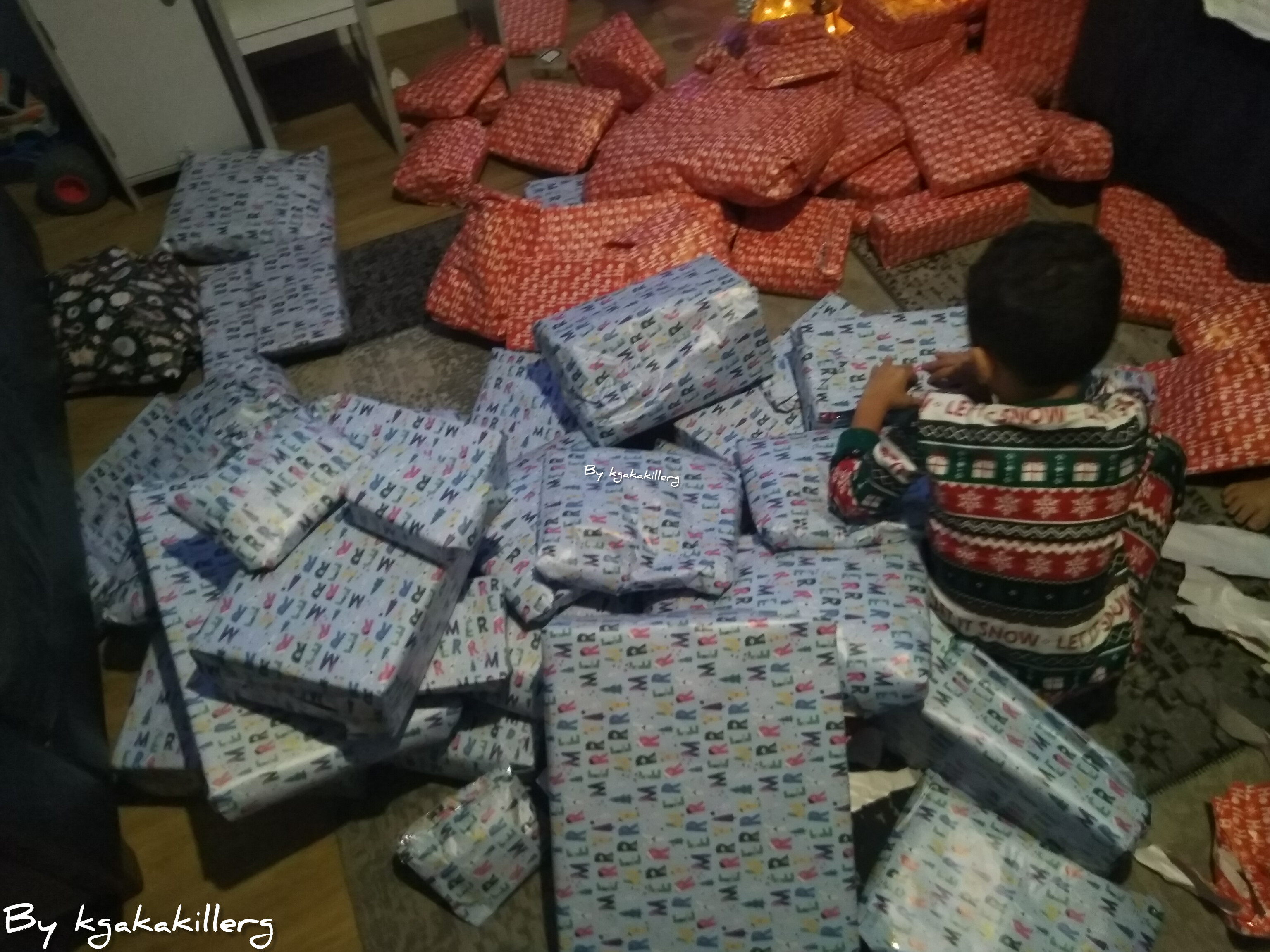 Here's some photos I took yesterday here's a photo of my son with his presents the blue one's were his and the red one's were my daughter's presents we always go overboard with presents but it's definitely worth to see the happiness of the kid's