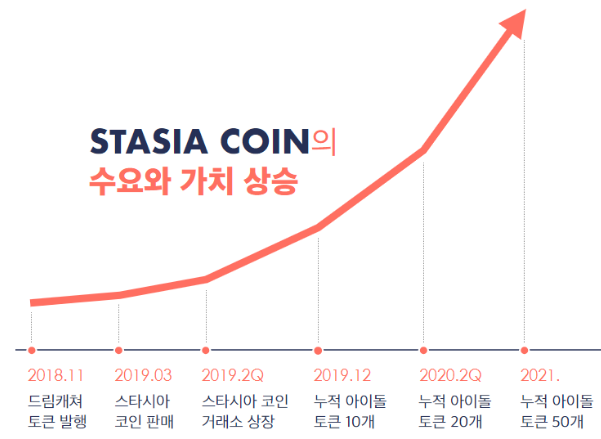 기축통화인 스타시아 코인의 발행량은 한정되어 있기에 더 많은 아이돌과 팬이 생태계에 참여해 아이돌토큰이 늘어날수록 타시아 코인의 수요와 가치는 안정적으로 상승하게 됩니다.