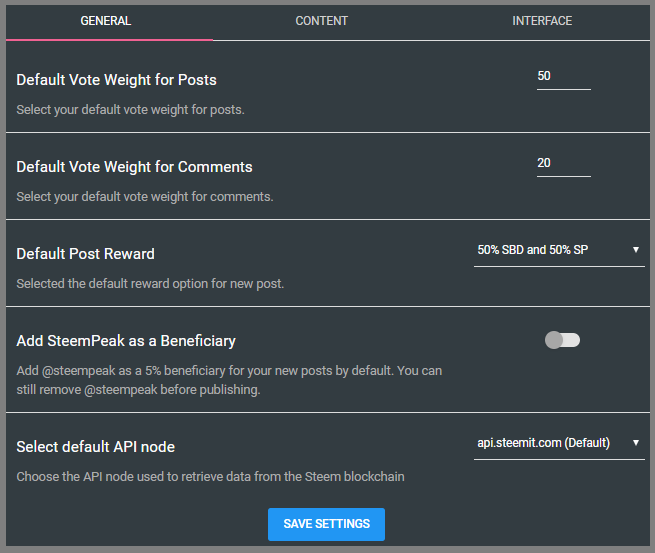 Here you can set a default weight for your votes. Not only for the articles you are voting, but also the comments. That's something that I really love about the features in Steempeak. I don't have to use the slider all the time, but can now easily click on vote, as Steempeak remembers my default voting weight I've set here. And if you like Steempeak to earn a bit of your rewards as a thank you for their work, you can now set them as a beneficiary by enabling that button. When you enable this button, Steempeak will get 5% of your rewards from every article you publish through Steempeak. Good thing to know is, that you can disable this manually on each article you're going to publish.